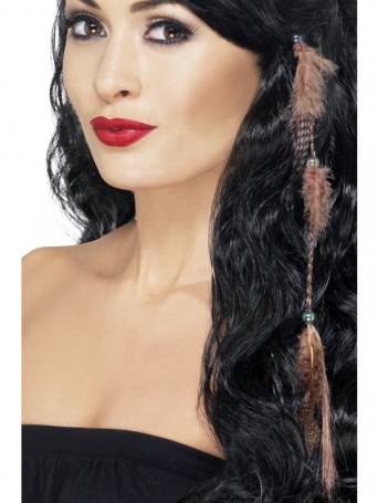Hnědý příčesek do vlasů zdobený pírky s korálkami. Je vhodný ke kostýmu indiánky.
